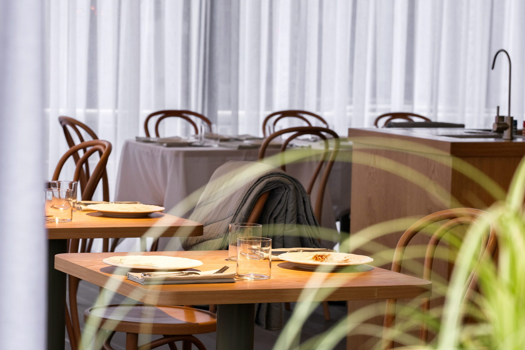 Интерьер ресторана, разработанный известным архитектором Алексеем Пенюком, воплощает идеи скандинавского минимализма, наполненного теплом и естественным светом. Пастельные тона, натуральное светлое дерево, текстурированные стены и мягкие кожаные диваны формируют уютное пространство, где каждая деталь продумана до мелочей. Столики у окна, созданные для ощущения свободы, идеально подходят для романтических встреч, где пары могут наслаждаться взаимным вниманием в уединении.